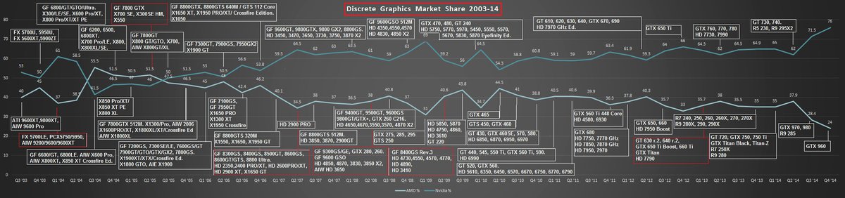В апреле этого года пользователи тематического форума Beyond3d создали консолидированный график долей AMD и Nvidia, опираясь на данные той же Mercury Research. Стоит отметить, что названия видеокарт обозначают момент появления в продаже, а не размер доли конкретной видеокарты.