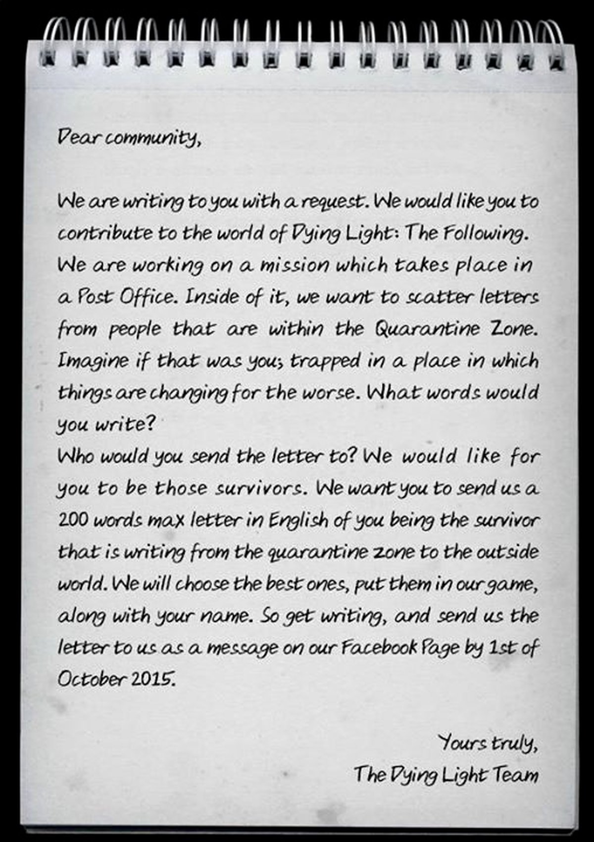Все дело в том, что в дополнении The Following игрокам встретится заброшенное почтовое отделение, по полу которого будет разбросано множество писем; на своей страничке в Facebook разработчики объявили конкурс на лучшие сообщения объемом до 200 символов, написанные от лица людей, находящихся в карантинной зоне.