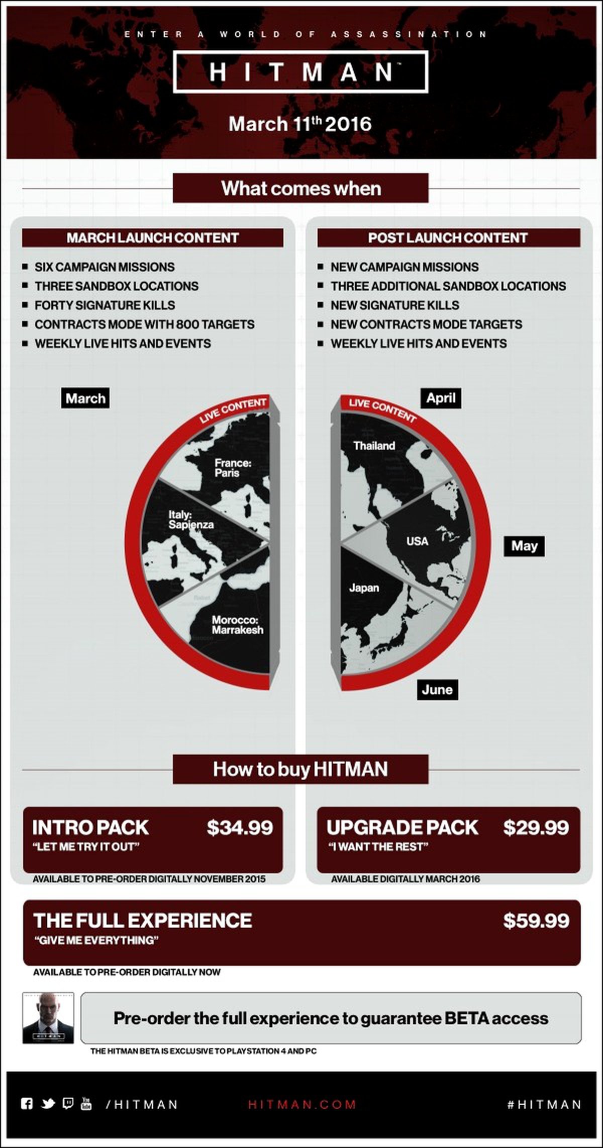Цифровая версия Hitman выйдет на PC, Xbox One и PlayStation 4 11 марта 2016 года и будет содержать кампанию из шести уровней в трех локациях: Париже, Сапиенца и Марракеше. Кроме того, игрокам будут доступны 800 целей в режиме Контрактов.