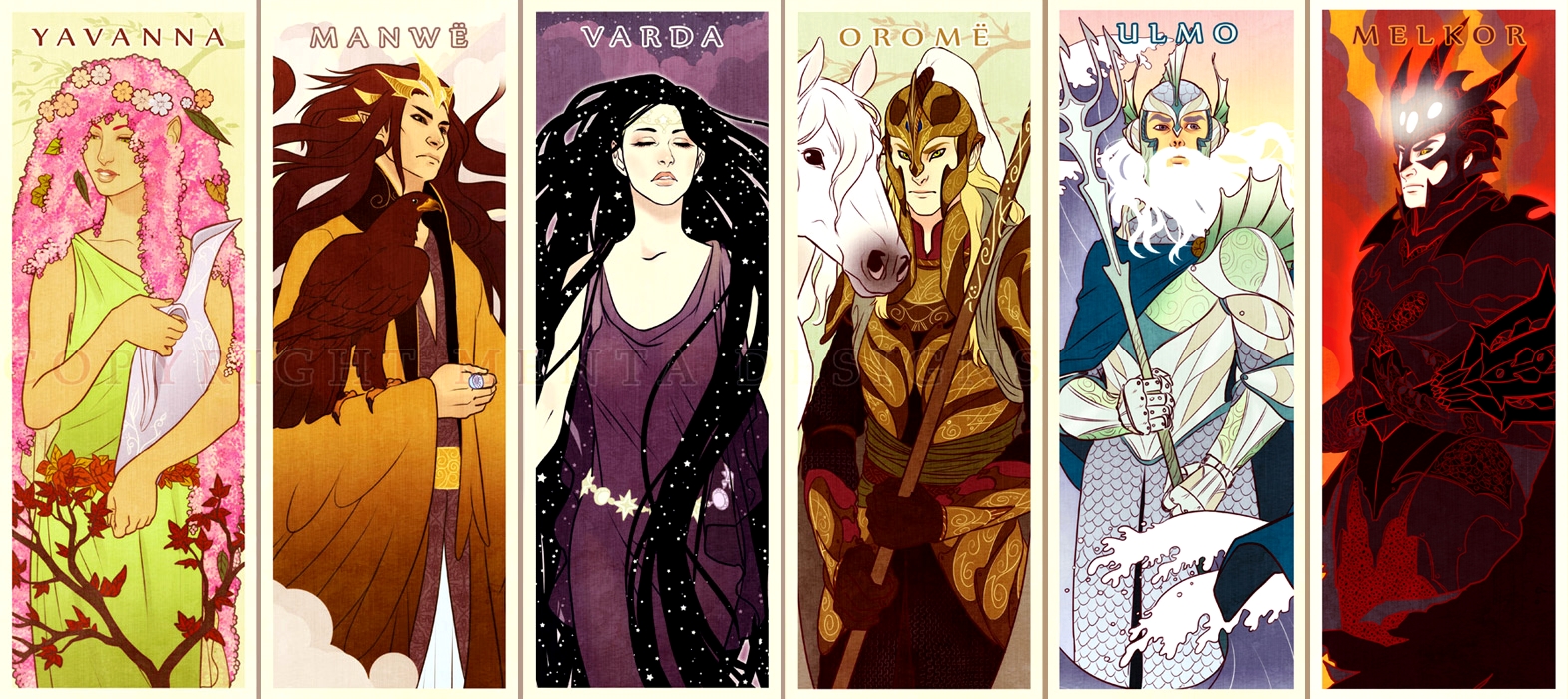 Валар всего пришло 14. Владыки валар: Манвэ, Ауле, Ульмо, Оромэ, Мандос, Лориэн и Тулкас. Владычицы, жены, владык валар: Варда, Йаванна, Ниэнна, Эстре, Вбарэ, Вана и Несса.