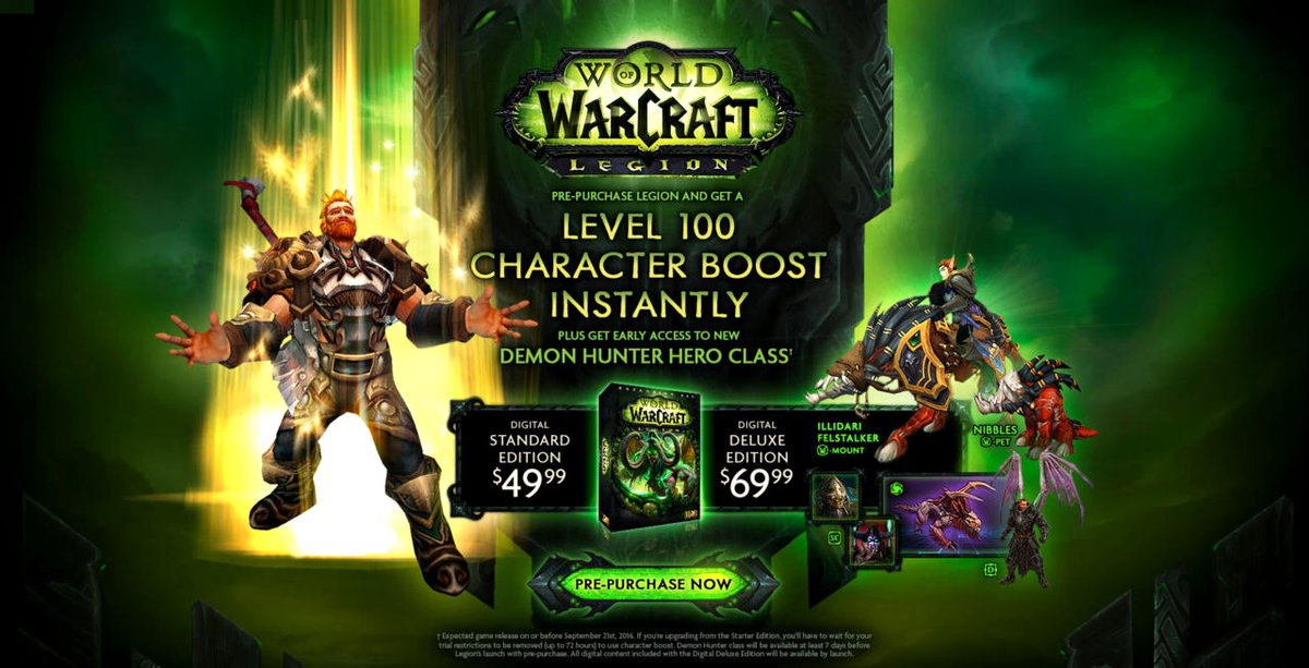 Этот же постер раскрывает бонусы за предзаказ дополнения. Игроки, предзаказавшие World of Warcraft: Legion, получат бесплатный подъем одного из своих персонажей до 100 уровня, а также ранний доступ к новому классу, Охотнику на демонов. В делюкс-издание войдут также внутриигровой маунт, питомец, а также контент для Diablo 3 и StarCraft 2.