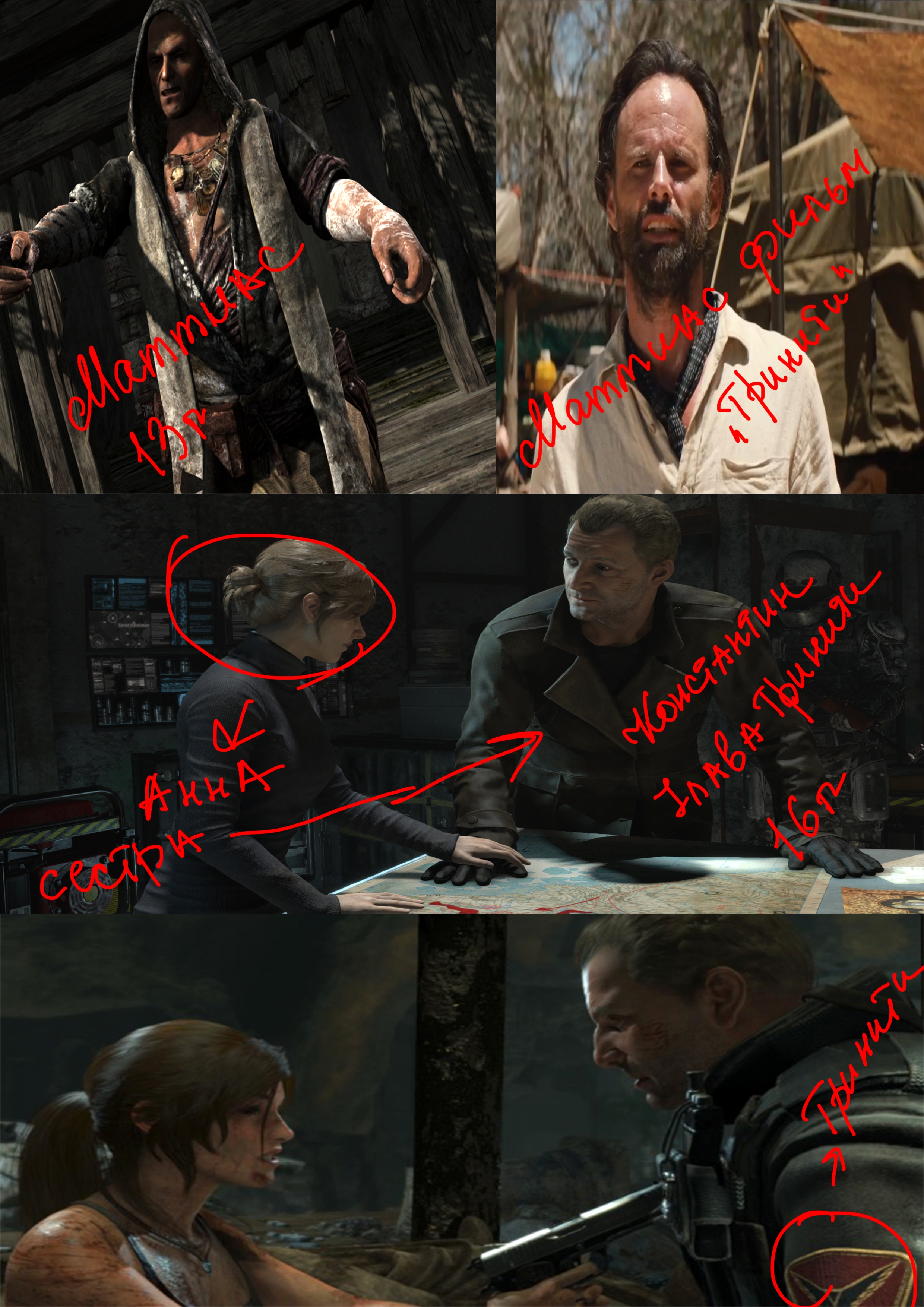 4.Окей. Приплывает она такая на остров, и тут бьют ее оружием по затылку. Очухивается она уже в какой-то палатке с Маттиасом. Маттиас и Тринити - это вообще две отдельных истории. Кто не играл в перезапуск игры 2к13 и 2к16 года, те, конечно, не поймут. Но. Дело в том, что Маттиас, действительно был в 13 игре, но он был там представителем выжившего острова, который похитил подругу Лары, для того, чтобы отдать ее жертвенно для Пимико(Химико). Он вообще никак не был связан с Тринити, а тем более уж с Анной. Кстати, говоря, про Анну. Половину кинокритиков, даже не поняли кто это. А все потому, что они не играли в эти игры. И Анна вообще появляется только в игре 16 года!!! Анна - это новая жена Ричарда Крофта, после Амелии(мамы Лары). И эта стерва, связана с Тринити, которые тоже появляются только во второй игре! Но режиссер, решил "К черту хронологию, я сделаю лучше!" Намешал полное Г. Маттиаса связал с Тринити, мол он там чуть ли не глава, Анну сделала сестрой Матиааса. Хотя в игре они вообще не связаны. Тринити в 13 игре упоминались только один раз, и то, когда Лара пыталась вызвать помощь, чтобы за ними приехали на остров и отозвался только самолет Тринити. Но они так и не смогли добраться до острова, и в игре их вообще не было. Поэтому, Тринити появляются полностью с главой и с Анной только во второй части Rise of Tomb Raider. Наверно, это самая большая часть, которая меня возмутила. Если вы не разбираетесь в играх, и не знаете их сюжет, не надо мешать все вместе, чтобы получить абракадабру.