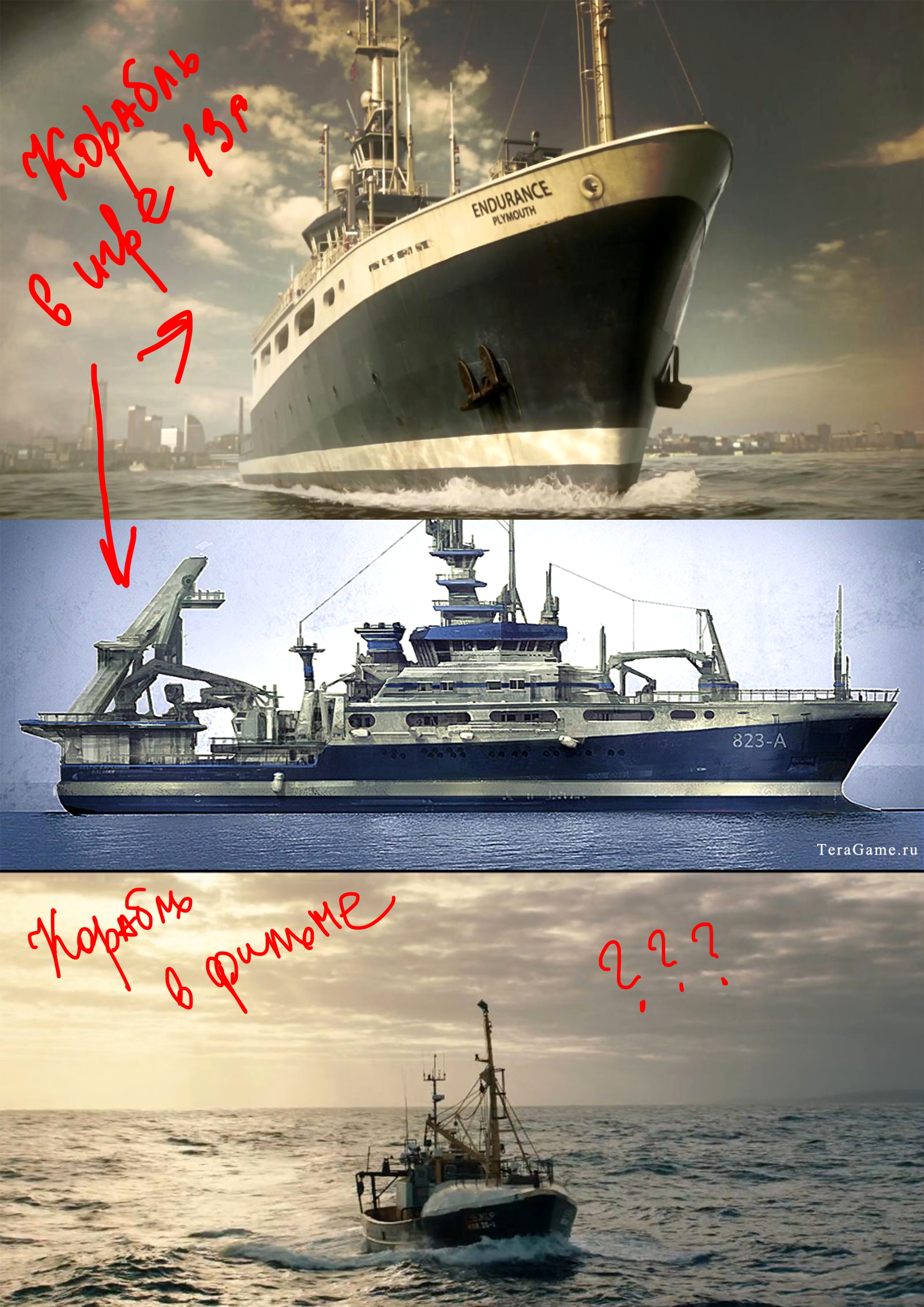 2.Прыгаем дальше. И вот, она случайно находит в мавзолее отца кабинет, его документы, и записи об Яматае и Химико.( Да, в игре была Пимико, но здесь сделали все верно, так как по настоящим мифам эту богиню звали Химико). И тут она думает: "А что, если он живой, поеду-ка я искать его на Яматай". Ее отец, вроде как купил корабль "Эндьюранс" за 20.000 тыс долларов, и она поехала его искать. Ну я думала, что может хоть корабль вывезет, потому что обещали, что сцена с кораблем, будет прям как в игре! Он рушится напополам и Лара такая прыгает, прям как в игре, и по сути ее должен был схватить Ротт(друг отца, с которым Лара отправилась в экспедицию в игре 2013 года). Но в фильме о нем, да и об остальных участниках экспедиции из игры ничего сказано не было. Так вот. Если в игре корабль был очень внушительных размеров, то в фильме, это было похоже на детский кораблик в ванной. А сцена с крушением - это полный провал. Ну да, рушится он напополам, но Лара прыгает с конца корабля (извините, не знаю тонкости названий) в океан. И никто ее там, за руку не хватает, она просто прыгает в воду. Это просто ужас! Одной из главных сцен игры, был именно этот момент, когда корабль рушится, и Ротт ей кричит: "Давай, Лара, ты сможешь!" Поверив, в свои силы, она разбегается и прыгает на другой конец корабля, и Ротт ее схватил, но что-то пошло не так и Лара упала в океан. Эти две сцены(из фильма, и из игры) как небо и земля. Полный провал.