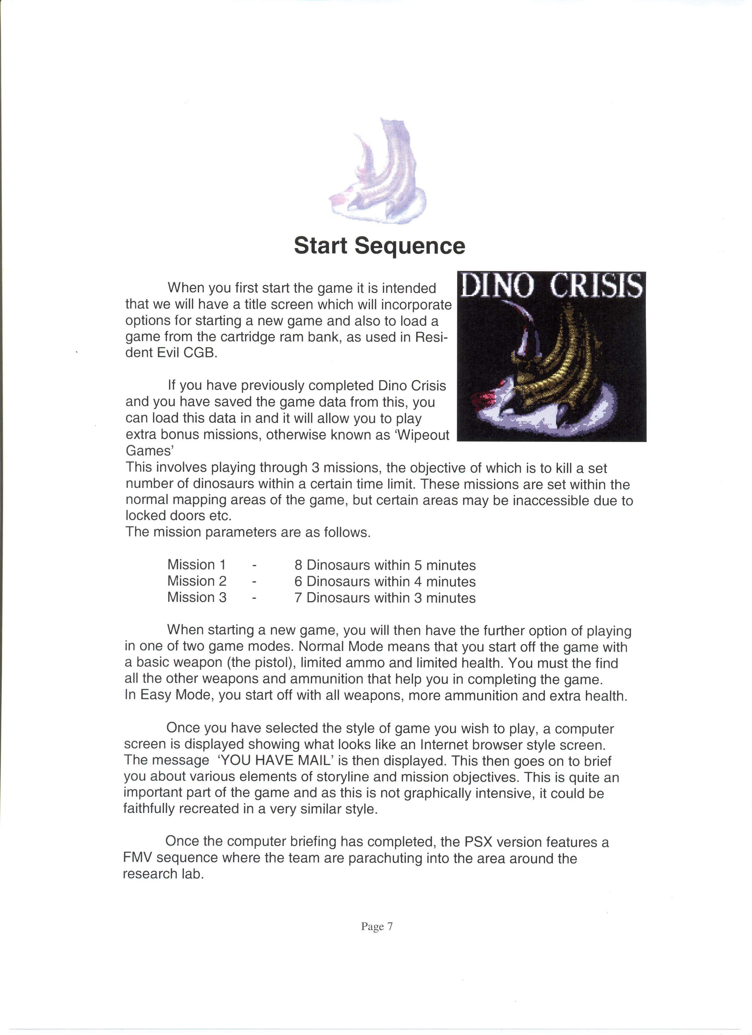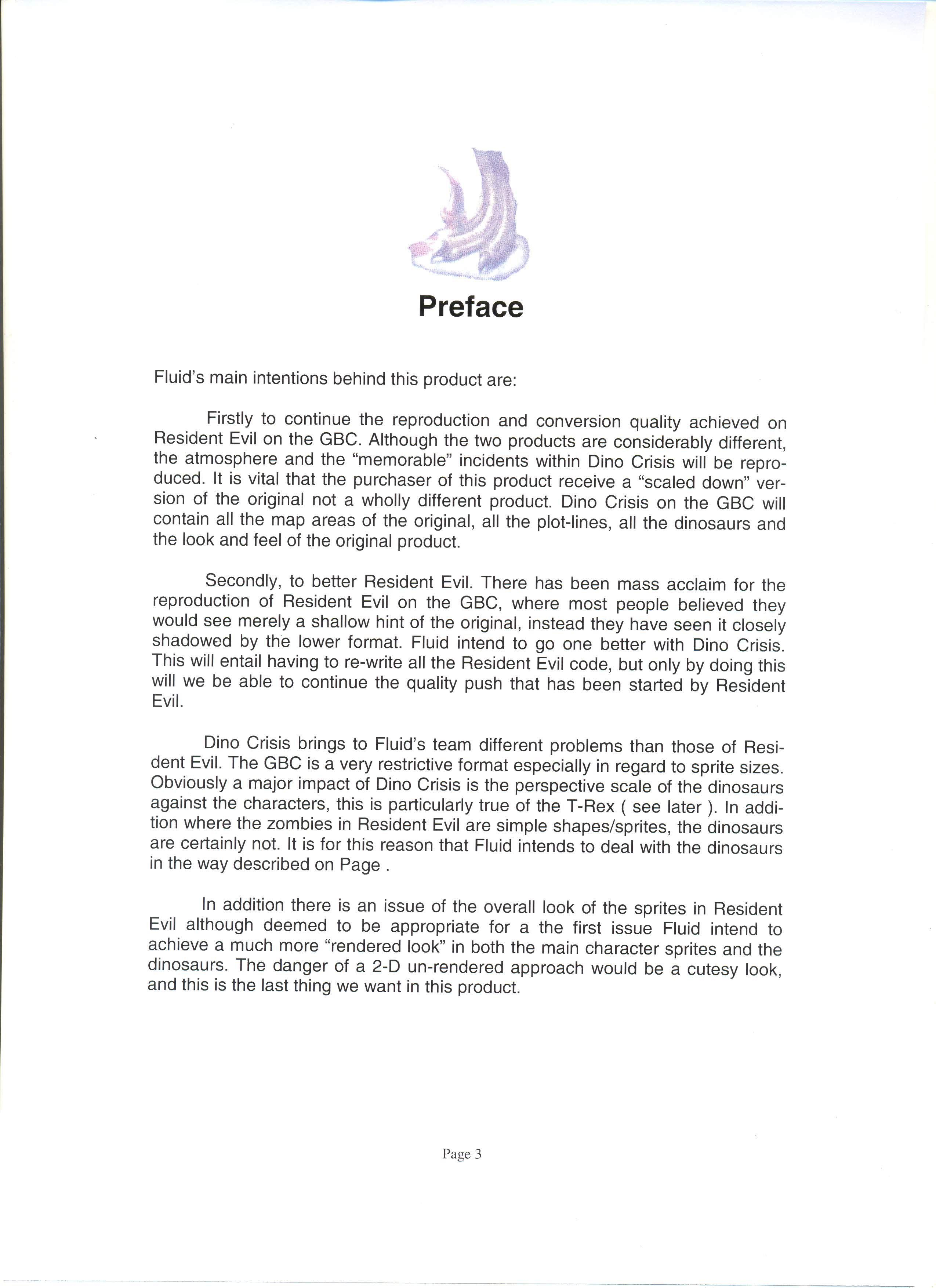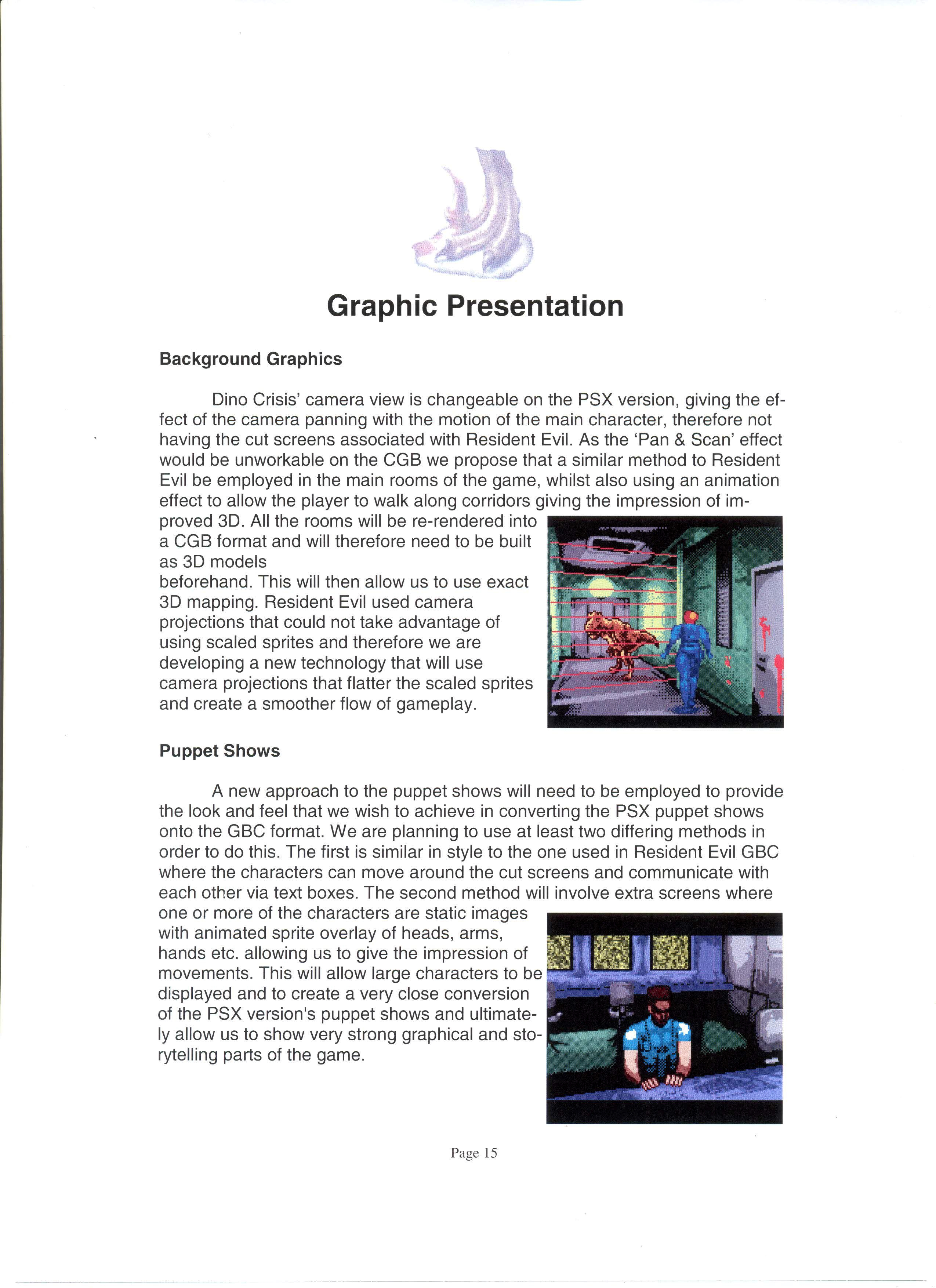 Было создано несколько демо-версий. К разработке были привлечены несколько разных студий, включая M4, которая занималась переносом первой части Resident Evil на GameBoy Color... Но как мы видим, ни Resident Evil, ни Dino Crisis не вышли на эту консоль в качестве порта. Однако, позже, разработка перешла к студии Fluid Studios, концепт-книга которой была слита в сеть. С книгой, на английском языке, вы можете ознакомится лично, в ней описаны как графические особенности игры, так и управление, сюжет и дополнительные режимы.