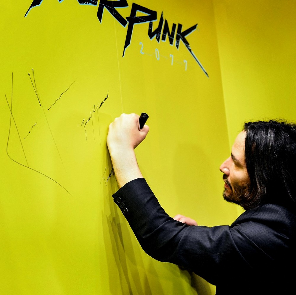 Ривз сфотографировался на реплике байка Ви, главного героя игры, и оставил автограф на стене стенда. Посидеть на реплике мотоцикла смогут и обычные посетители Tokyo Game Show.