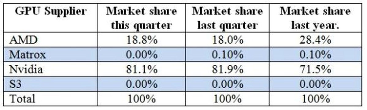 Таким образом, AMD сейчас контролирует 18.8% рынка GPU, на долю Nvidia приходится 81.1%. Годом ранее у AMD было 28.4% рынка против 71.5% у Nvidia.