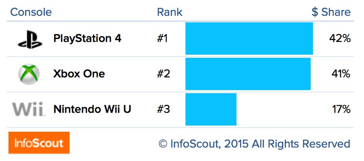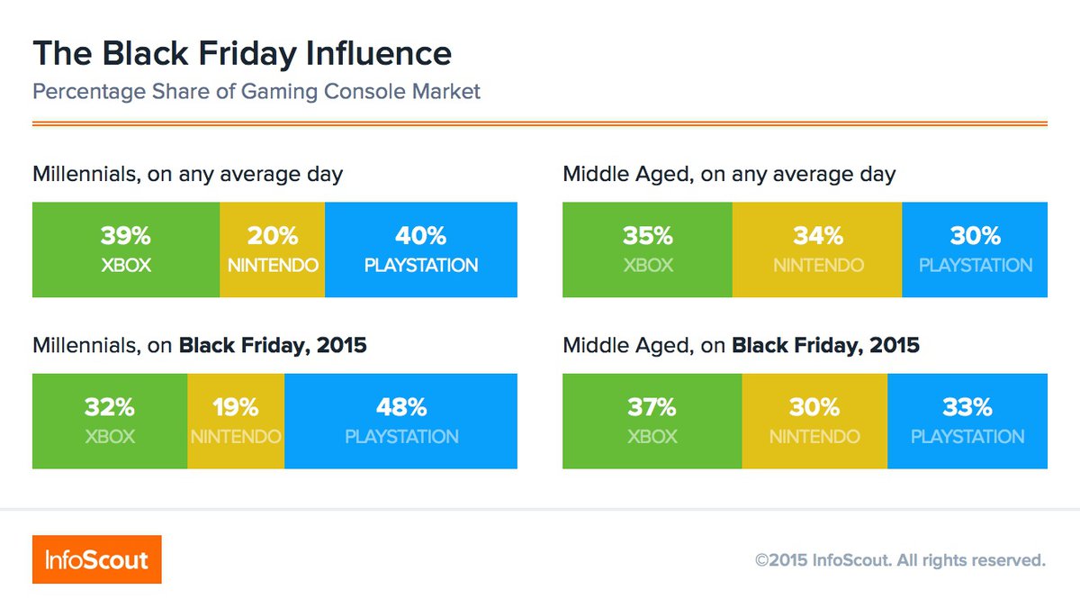 К слову, аналитическая компания Infoscout утверждает, что во время Черной Пятницы PlayStaion 4 была самой популярной консолью у покупателей в возрасте от 18 до 35 лет; люди среднего возраста (36-55) предпочитали Xbox One. В общем зачете PlayStation 4 обошла Xbox One на 1%.