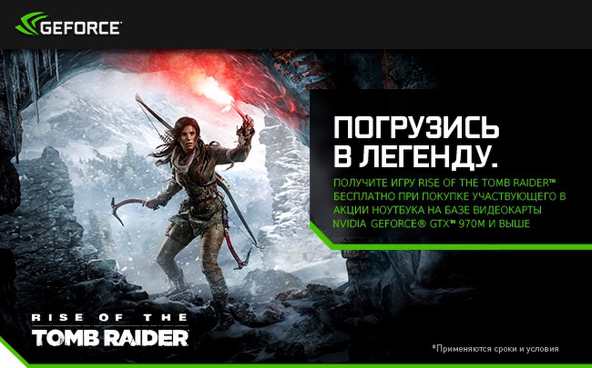 С 8 января по 16 февраля 2016 года при покупке ноутбука на базе GeForce GTX 970M и выше вы получите игру Rise of the Tomb RaiderTM БЕСПЛАТНО.