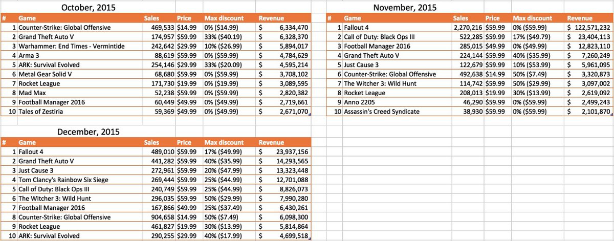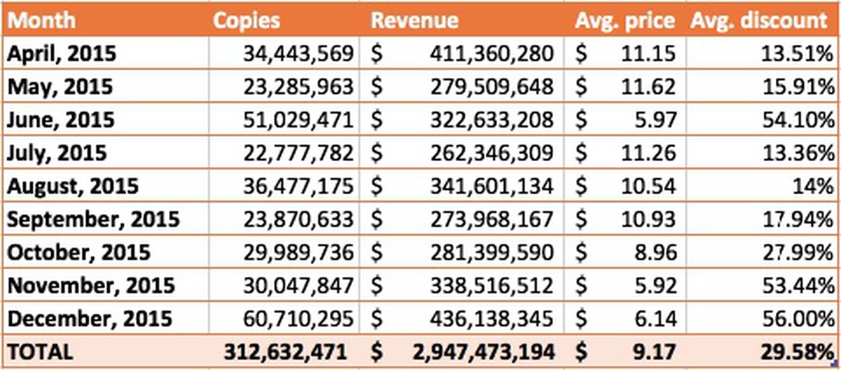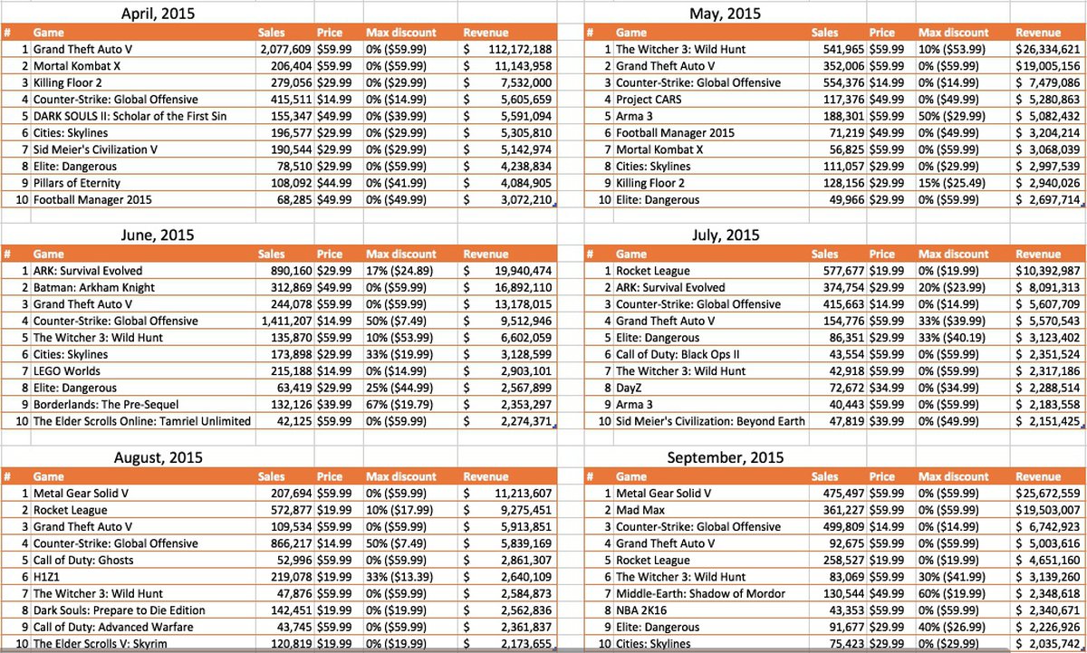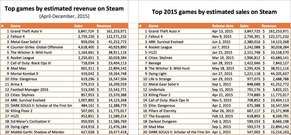 Сергей Галенкин, создатель аналитического сервиса SteamSpy, опубликовал данные о продажах игр через сервис Steam за 2015 год. Согласно отчету Сергея, за год было продано около 350 миллионов копий игр, это принесло разработчикам порядка $3.5 миллиардов.