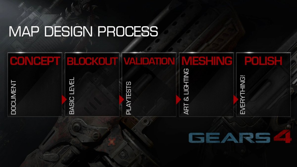 Black Tusk Studios раньше не работала над серией Gears of War, так что разработчики изучили все карты оригинальных игр, а затем сделали множество тестовых карт, следуя вот такому шаблону: