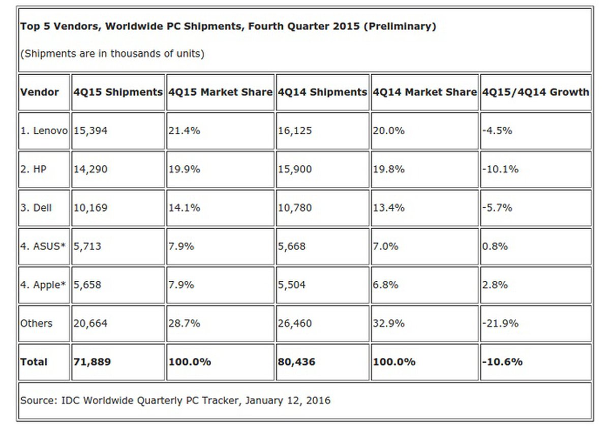 Согласно данным IDC, в 4 квартале прошлого года падение продаж наблюдалось практически у всех вендоров: роста удалось добиться лишь ASUS (0.8%) и Apple (2.8%). Всего в 4 квартале было реализовано более 71889000 устройств, почти на 9 миллионов меньше, чем в том же квартале годом ранее (80436000 устройств).