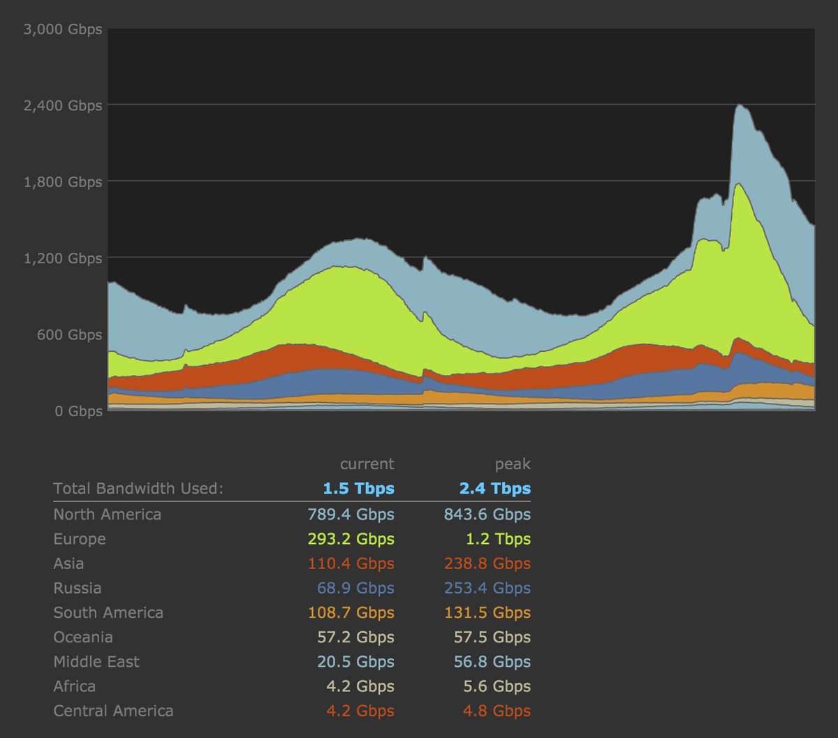 Чтобы справиться с выросшей нагрузкой Valve пришлось подключить еще несколько каналов связи по 100 гигабит каждый - к сожалению, мы точно не знаем, сколько именно, однако график выше говорит сам за себя: в пике Steam нужно 2400 гигабит, причем на графике совершенно обычный день - в момент выхода чего-то крупного ситуация может выглядеть несколько иначе.