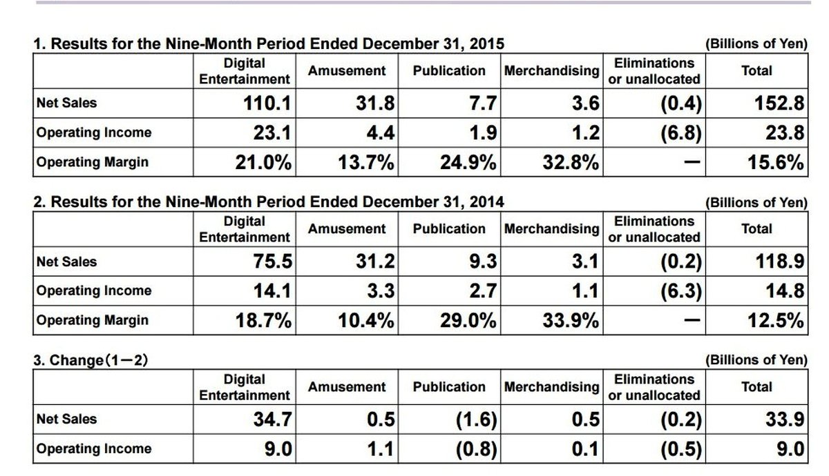 Продажи продуктов Square Enix в сегменте цифровых развлечений (наиболее прибыльная область деятельности компании) выросли на 34.7 миллиарда йен, операционная прибыль увеличилась на 9 миллиардов йен, составив 110 и 23 миллиарда йен соответственно.