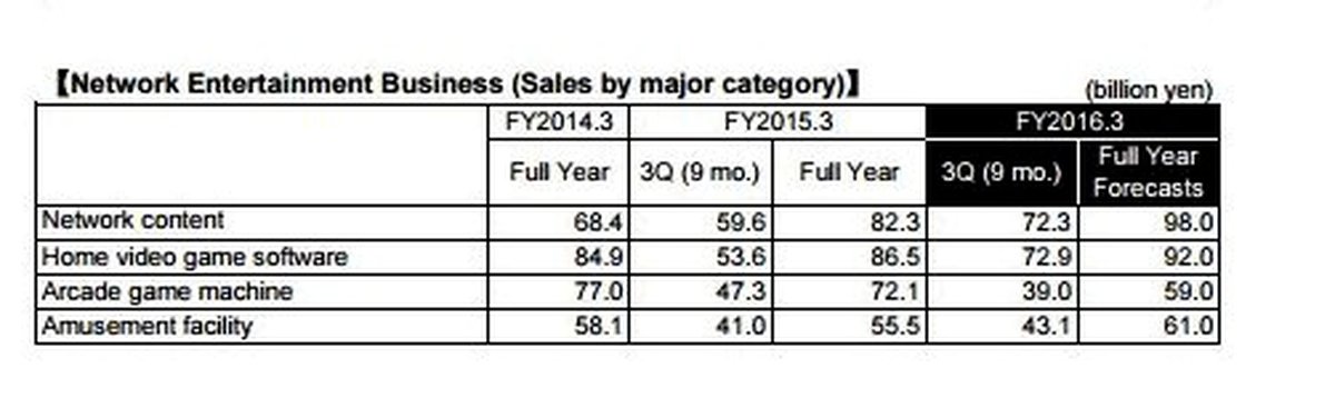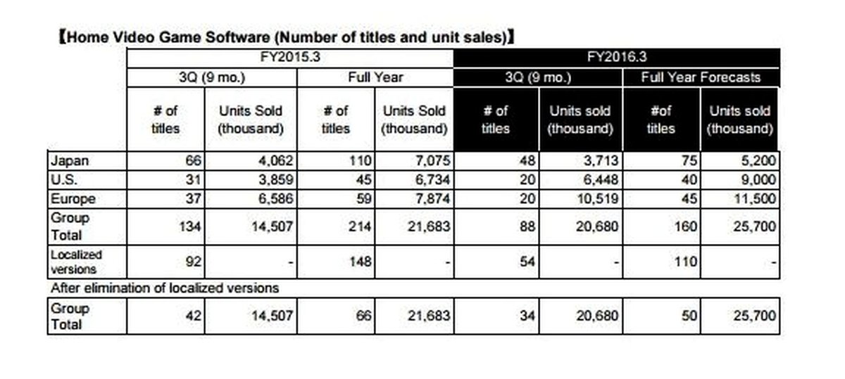 Компания также сообщила, что за прошедшие 9 месяцев было продано 20 миллионов 680 тысяч копий игр; предполагается, что к концу финансового года будет продано около 26 миллионов копий. Самым большим рынком для Bandai Namco остается Европа (10.5 миллионов копий), затем идет США с 6.4 миллионами, в Японии реализовано 3.7 миллиона копий игр компании.