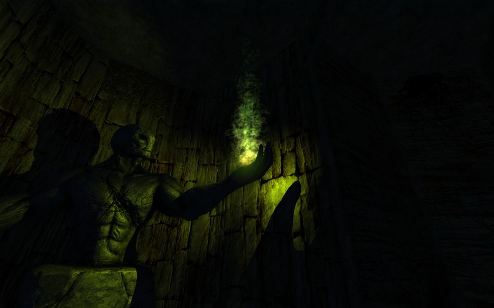 Господи, я бился в конвульсии, как только попал во внутрь гробницы Туурнгайта! Ведь для того, чтобы внутри нее открыть необходимые каменистые двери, требуется, казалось бы, всего лишь нажать на пару кирпичей около них. Который, между тем, абсолютно полностью сливаются со всей окружающей местностью, где присутствует исключительно тьма, а единственной подсказкой будут нарисованные красно-темным кетчупом стрелочки, указывающие на эти кирпичики, но увидеть которые сможет лишь Ваномас, разглядывая очередную текстурку.