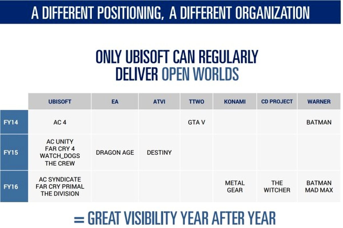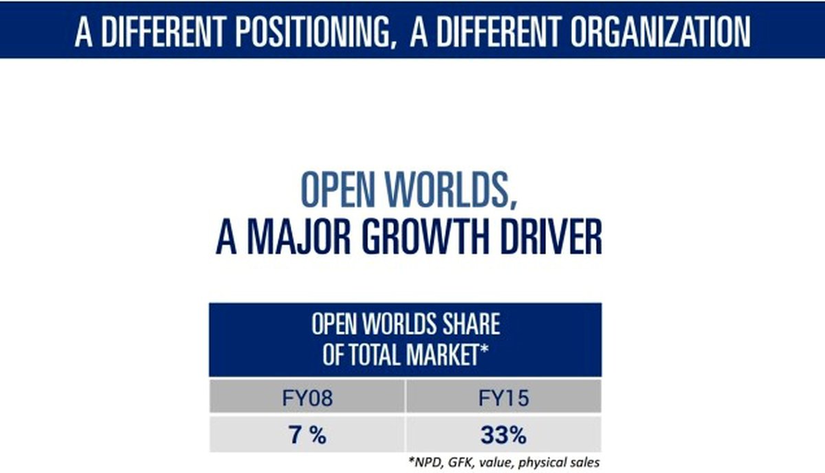 Игры с открытым миром хорошо продаются, но есть нюанс - это понимают не только в Ubisoft. Компания приводит следующую статистику NPD и GFK: в 2008 году игры с открытым миром занимали лишь 7% рынка, в 2015 году - уже 33%.