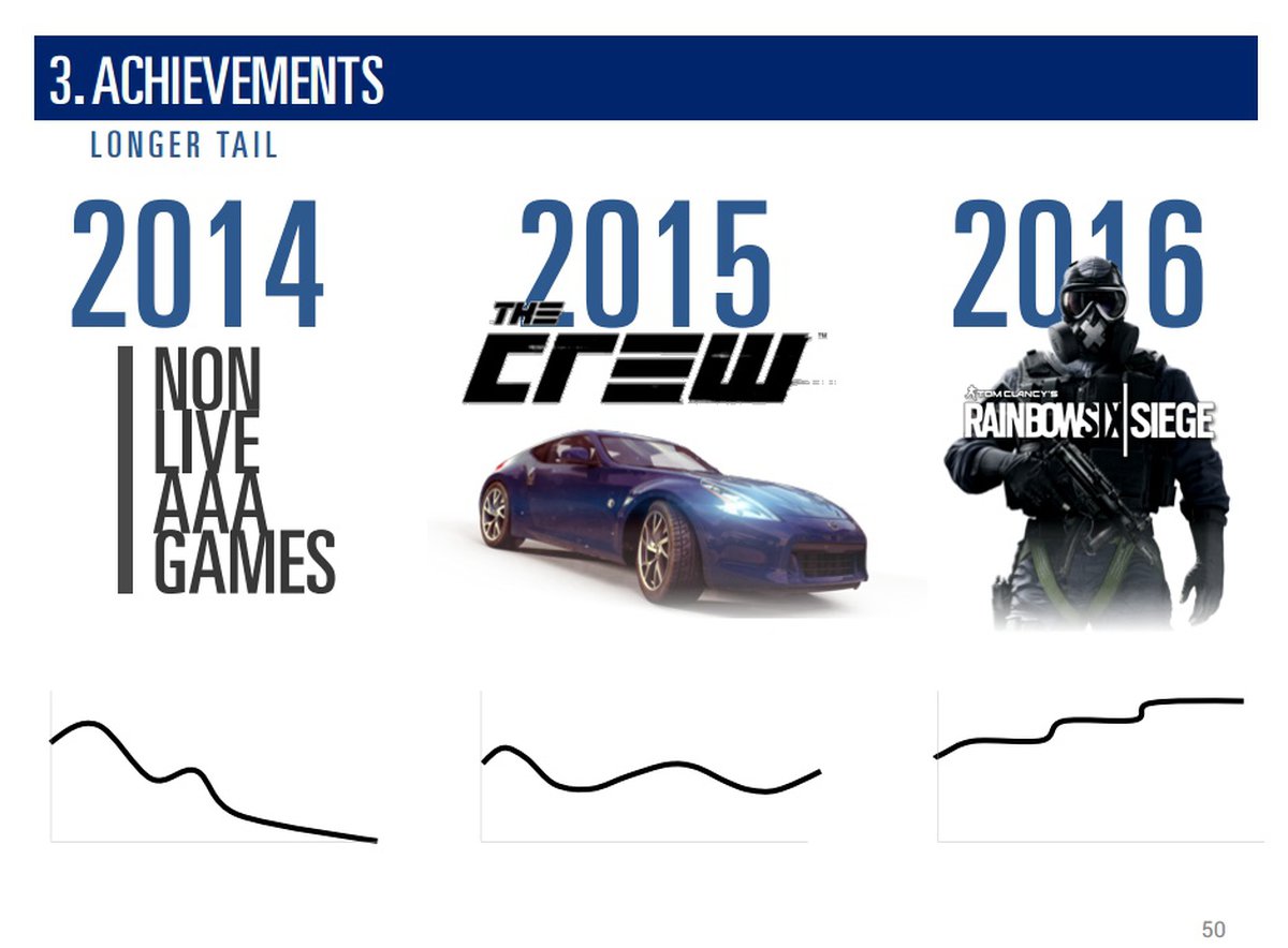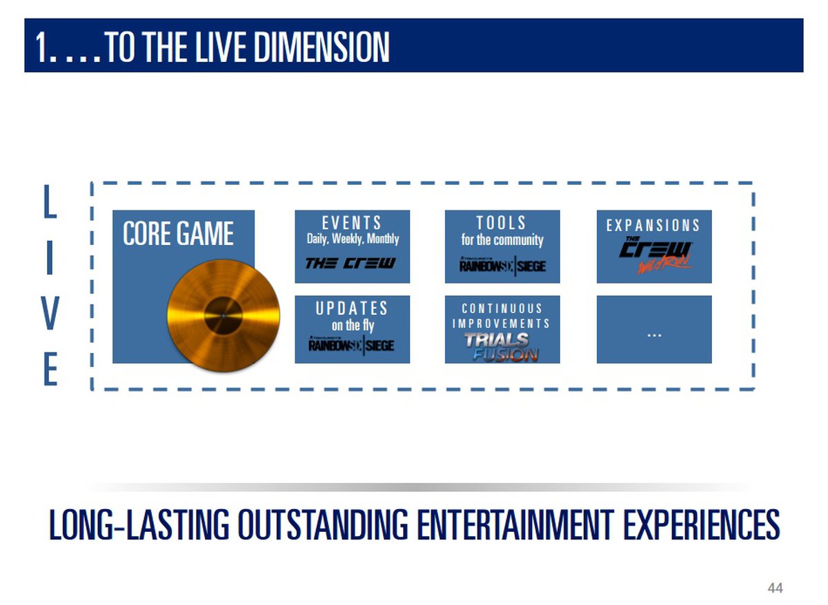Компания планирует отойти (и уже отходит) от традиционной модели с регулярным выпуском хитовых игр и перейти к постоянной поддержке уже вышедшей игры: обновления, внутриигровые события, инструменты для сообщества и дополнения. С The Crew вышла промашка, результаты Tom Clancy's Rainbow Six: Siege пока обнадеживают, а у The Division есть все шансы превзойти Siege.