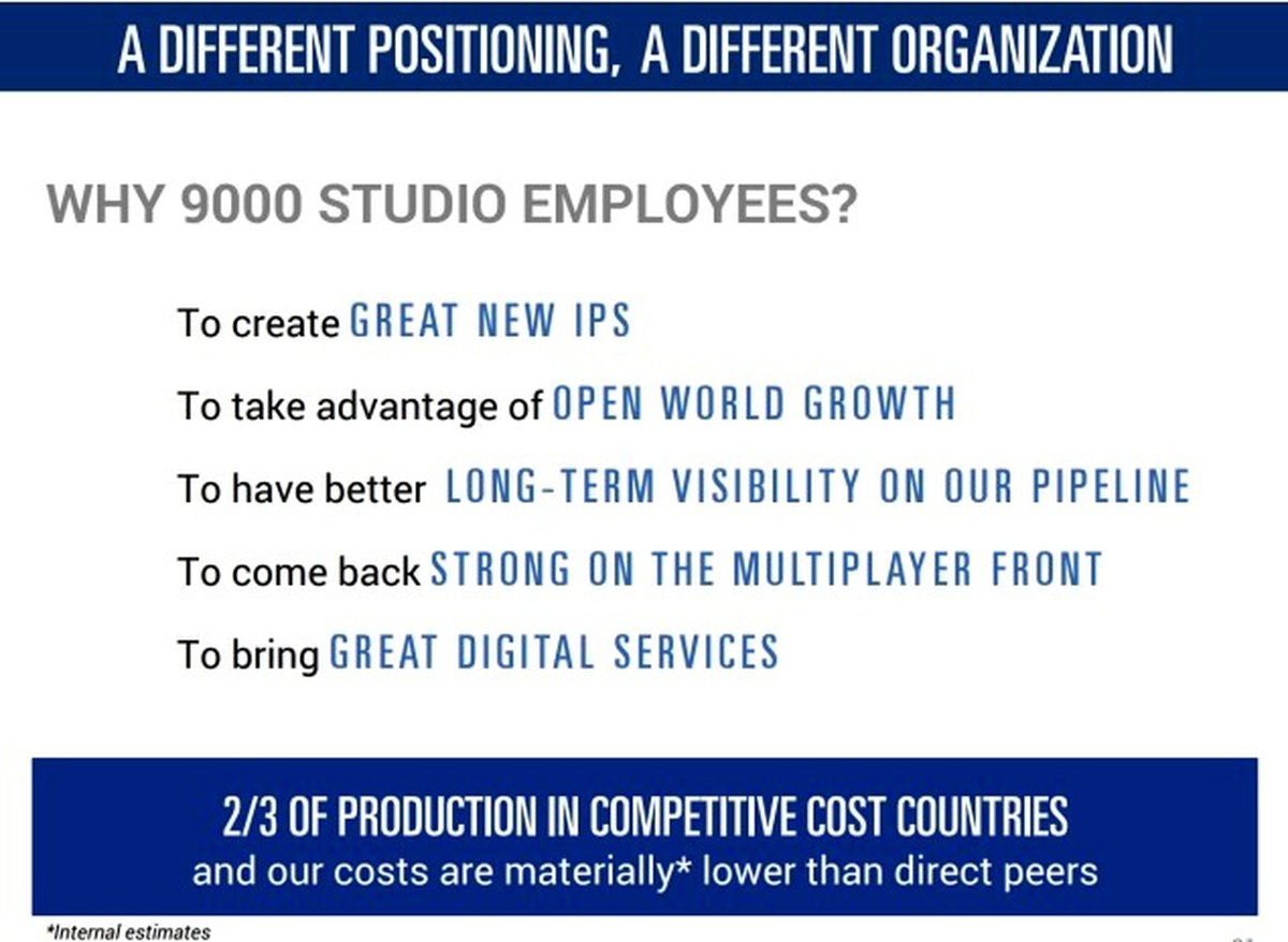 Для ежегодного выпуска нескольких игр с открытым миром нужно очень много людей: в Ubisoft сейчас трудятся 9 тысяч человек. Для сравнения - в CD Projekt RED (разработчик The Witcher 3) работают 250 человек (к самой игре, справедливости ради, в общей сложности приложило руку около полутора тысяч сотрудников студии и контрактников).