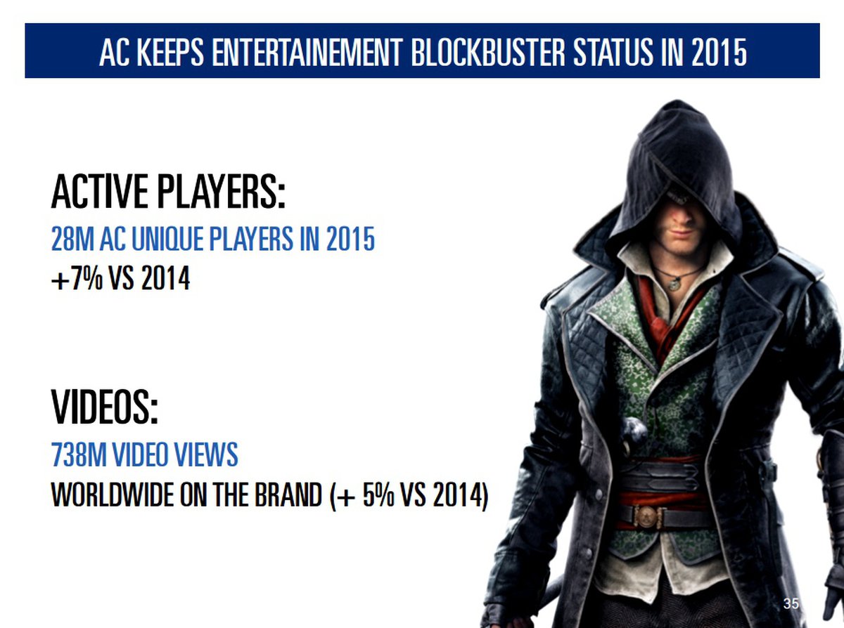 Это гигантское количество игроков. Например, только в 2015 году у серии Assassin’s Creed было 28 миллионов активных игроков, причем рост по сравнению с 2014 годом составил 7%.
