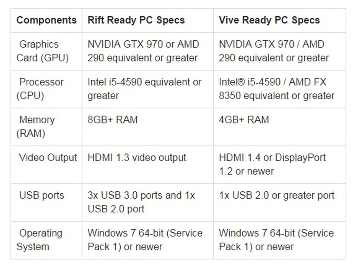Итак, для комфортной игры с использованием HTC Vive вам понадобится конфигурация, практически аналогичная таковой у Oculus Rift, конкурента Vive, разом переместившегося в бюджетную категорию.