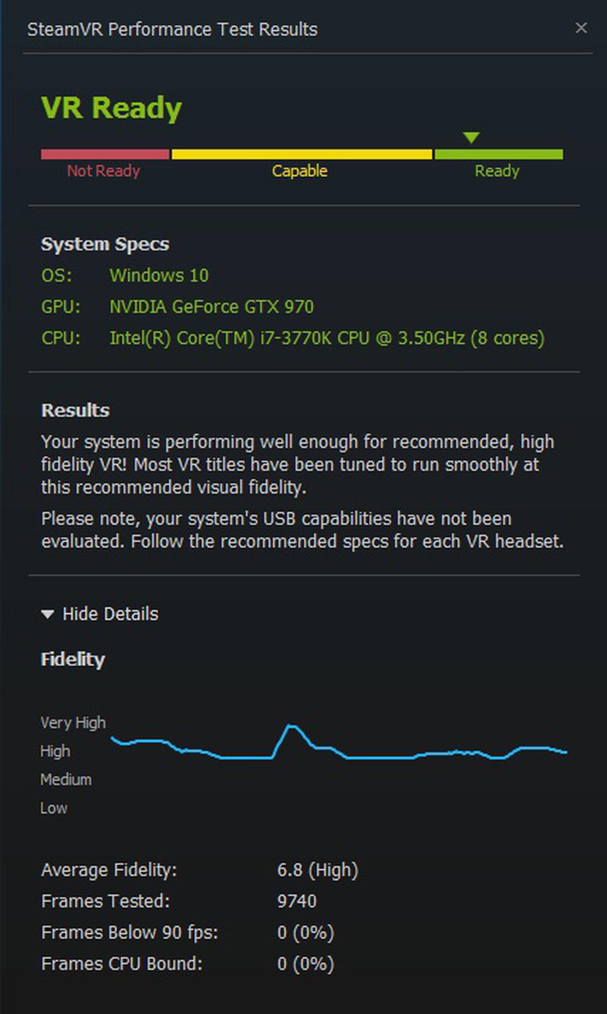 В Steam также появилось специальное приложение - пока оно, видимо, доступно не во всех регионах, с установкой может помочь steam://install/323910 - с помощью которого можно протестировать свой PC на совместимость с Vive. Выглядит это примерно так: