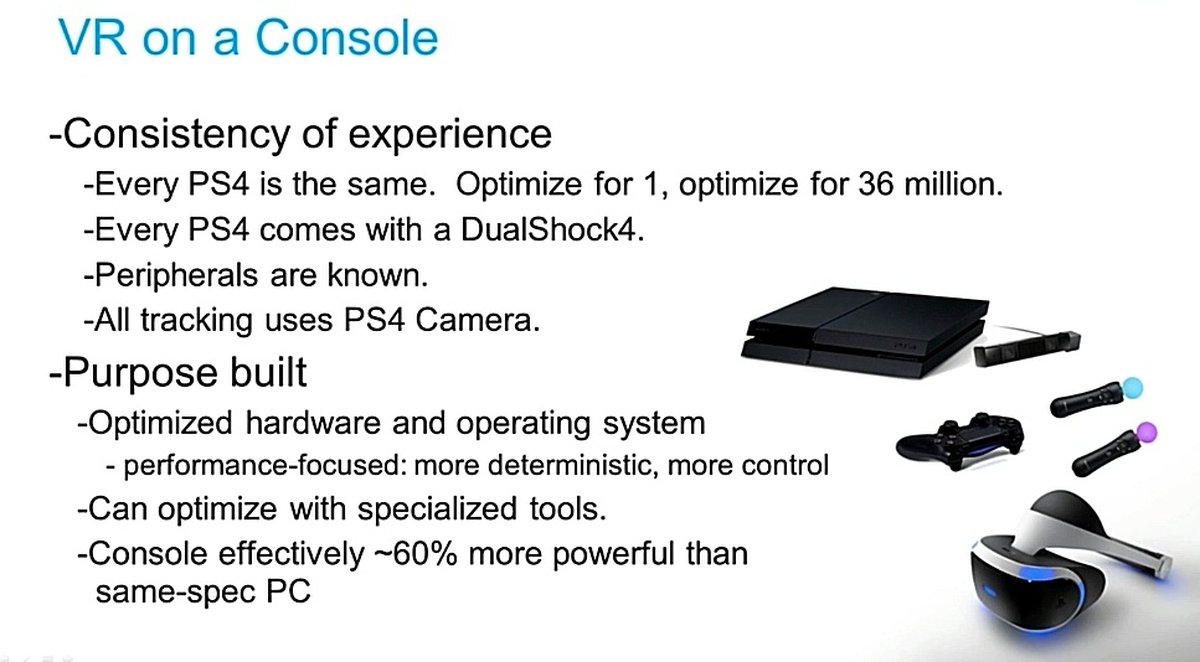 С точки зрения разработчиков создание VR-проекта для PlayStation 4 значительно проще, чем разработка под PC - не нужно думать о различных вариантах конфигурации пользовательского железа или поддержке разнообразных операционных систем, оптимизировать проект под единственную конфигурацию значительно проще.