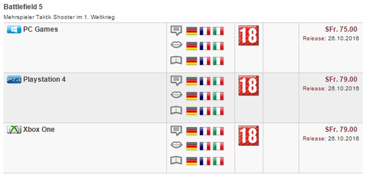 Швейцарцы сообщают, что Battlefield 5 будет "Mehrspieler Taktik Shooter im 1. Weltkrieg" - мультиплеерным тактическим шутером во времена Первой мировой войны.