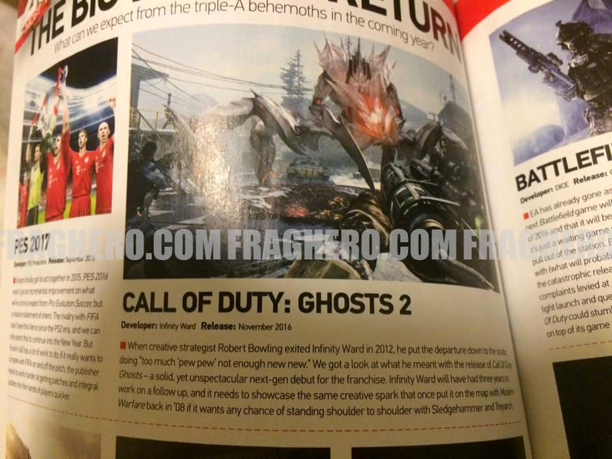 Значит ли это, что в ноябре мы непременно увидим продолжение приключений отряда "Призрак"? Совсем не обязательно. По соседству м Ghosts 2 можно увидеть PES 2017, а на соседней странице явно описан Battlefield 5.