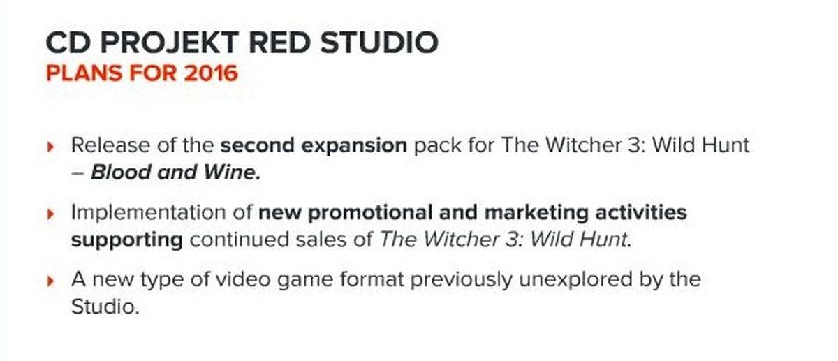 В 2016 году компания планирует выпустить второе дополнение для Ведьмака 3, Кровь и Вино, продолжать PR-поддержку игры и работать над "новым видом игр, ранее не исследованным студией".