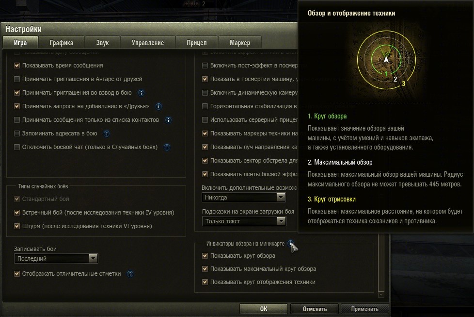 Добавлены круги обзора и видимости на мини-карте. Включить/выключить можно в окне настроек, вкладка «Игра», в правой нижней части окна.