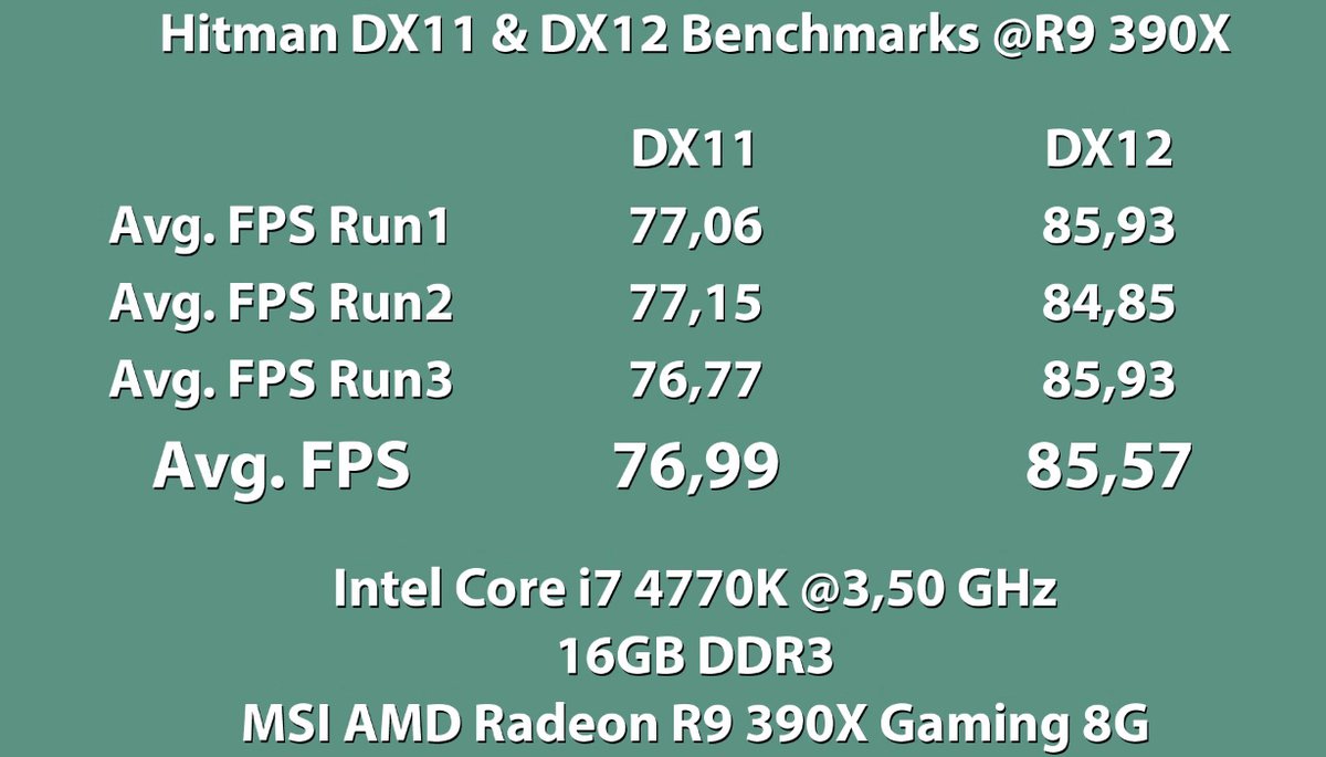 YouTube-канал Candyland задался тем же вопросом и протестировал Hitman с теми же настройками, что и раньше, но на этот раз взяв AMD Radeon R9 390X вместо Nvidia GeForce GTX 980. Результат? Уже лучше - с видеокартой от AMD DX12-версия Hitman наконец-то вырвалась вперед.