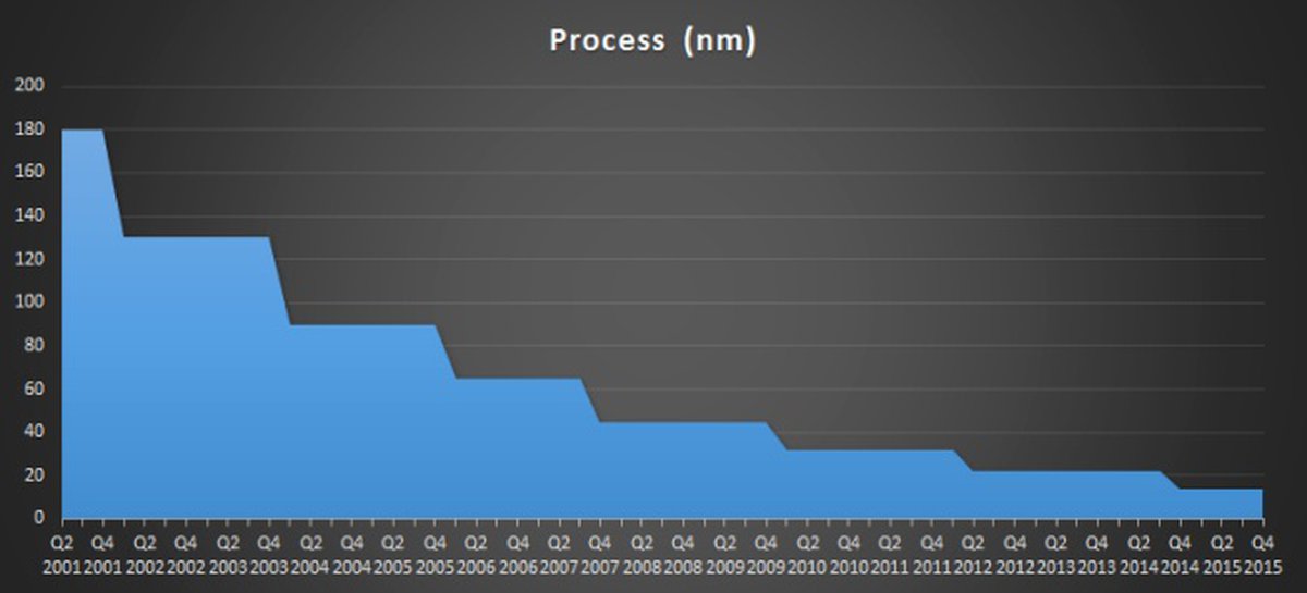 Зачем это Intel? Все дело в том, что уменьшать техпроцесс с каждым разом становится все сложнее. Если посмотреть на график чуть ниже, то можно заметить, что с течением времени техпроцесс уменьшается слабее, а переход на новый уровень занимает все больший срок.