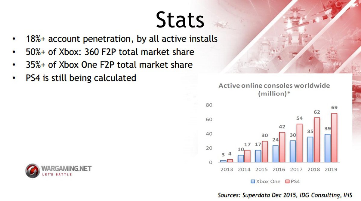 Судя по свежей презентации компании (там довольно много интересной информации о самой Wargaming), ссылающейся на данные аналитических фирм Superdata, IHS и IDG Consulting, PlayStation 4 продолжает лидировать.