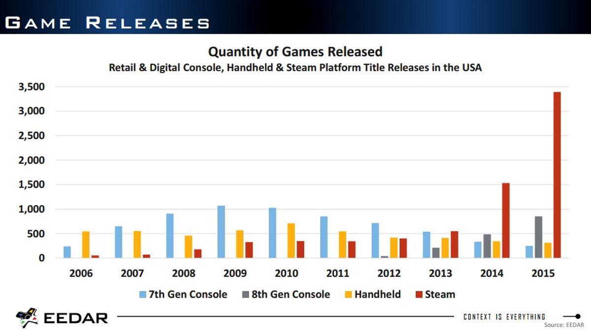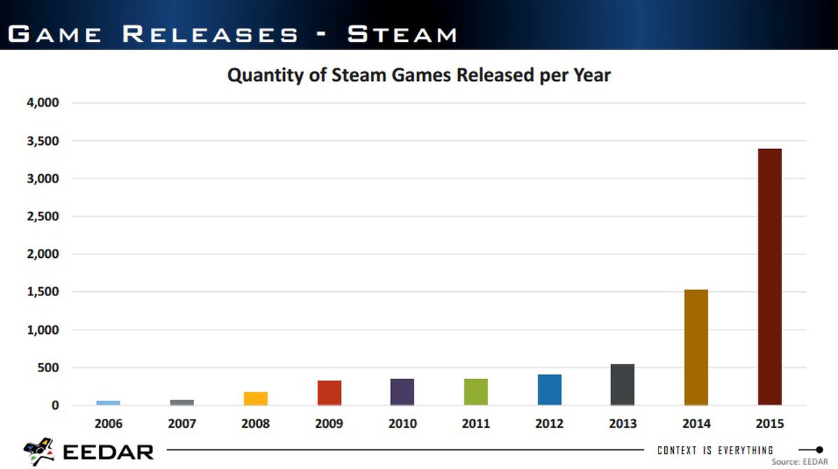 Говорим "игры на PC" - подразумеваем Steam, говорим Steam - подразумеваем "игры на PC". Прости, EA. Согласно данным аналитической компании EEDAR, представленным на GDC, в 2015 году количество игр, вышедших в Steam, удвоилось по сравнению с 2014 годом.
