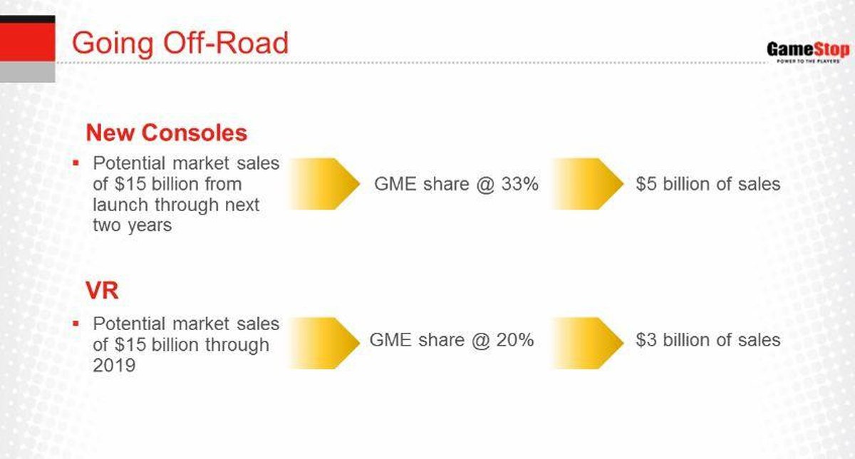 В GameStop предварительно оценивают рынок новых консолей в $15 миллиардов через два года после запуска, ритейлер планирует занять как минимум 33% этого рынка. Рынок VR-устройств оценивается примерно в $15 миллиардов к 2019 году, GameStop надеется занять около 20% VR-рынка.