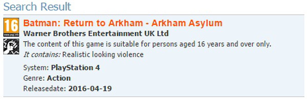 Представители Warner Bros. все еще воздерживаются от комментариев относительно возможного выхода ремастеров Batman: Arkham Asylum и Batman: Arkham City, однако сегодня выяснилось, что проект под названием Batman: Return to Arkham - Arkham Asylum уже получил рейтинг PEGI 16.