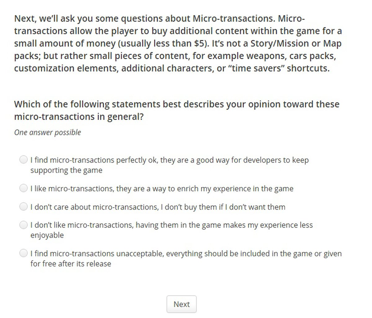 Так или иначе, в расширенной версии опроса есть один интересный вопрос: разработчики интересуются, что вы думаете о микротранзакциях. Под микротранзакциями подразумевается не покупка наборов миссий или сезонного пропуска, а недорогие (меньше $5) наборы снаряжения, кастомизации или дополнительные персонажи.