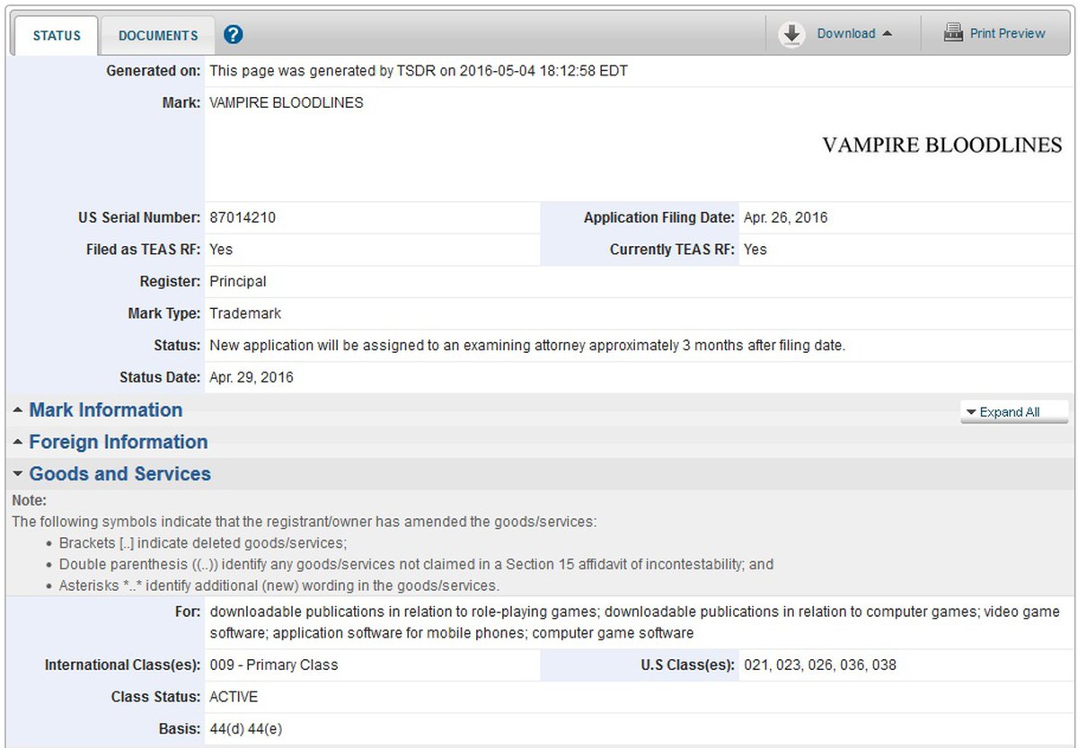 В 2015 году White Wolf Publishing была приобретена шведской компанией Paradox Interactive, занимающейся разработкой и изданием компьютерных игр - именно в этой категории и подана заявка на торговую марку Vampire Bloodlines. В том же году White Wolf Publishing зарегистрировала торговую марку Vampire: the Masquerade - тоже по классу видеоигр.
