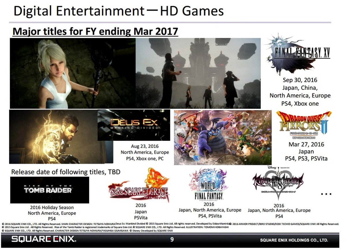 Похоже что фанатам Fantasy VII и любителям Kingdom Hearts придется подождать еще немного - судя по опубликованной сегодня презентации планов Square Enix на новый финансовый год, релиз римейка Fantasy VII, Nier: Automata и Kingdom Hearts III не состоится как минимум до марта 2017 года.
