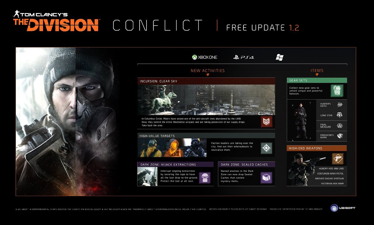 Помимо нового Вторжения "Чистое небо", в котором игрокам нужно будет нейтрализовать ПВО, захваченное заключенными, обновление добавит в The Division новое снаряжение и оружие, а также комплекты экипировки "Крайние меры" (сапер), "Одинокая звезда" (выживание), "Знак хищника" (боевик) и "Вера охотника" (снайпер).