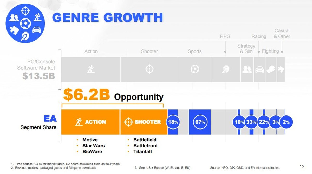 EA очень хочет занять как можно большую долю в самых популярных игровых жанрах, шутерах и экшенах, оценивая этот кусок рынка в $6.2 миллиарда. Сейчас на долю компании приходится около 18%, по словам Йоргенсена, одна успешная франшиза в одном из этих жанров может приносить компании до $400 миллионов.