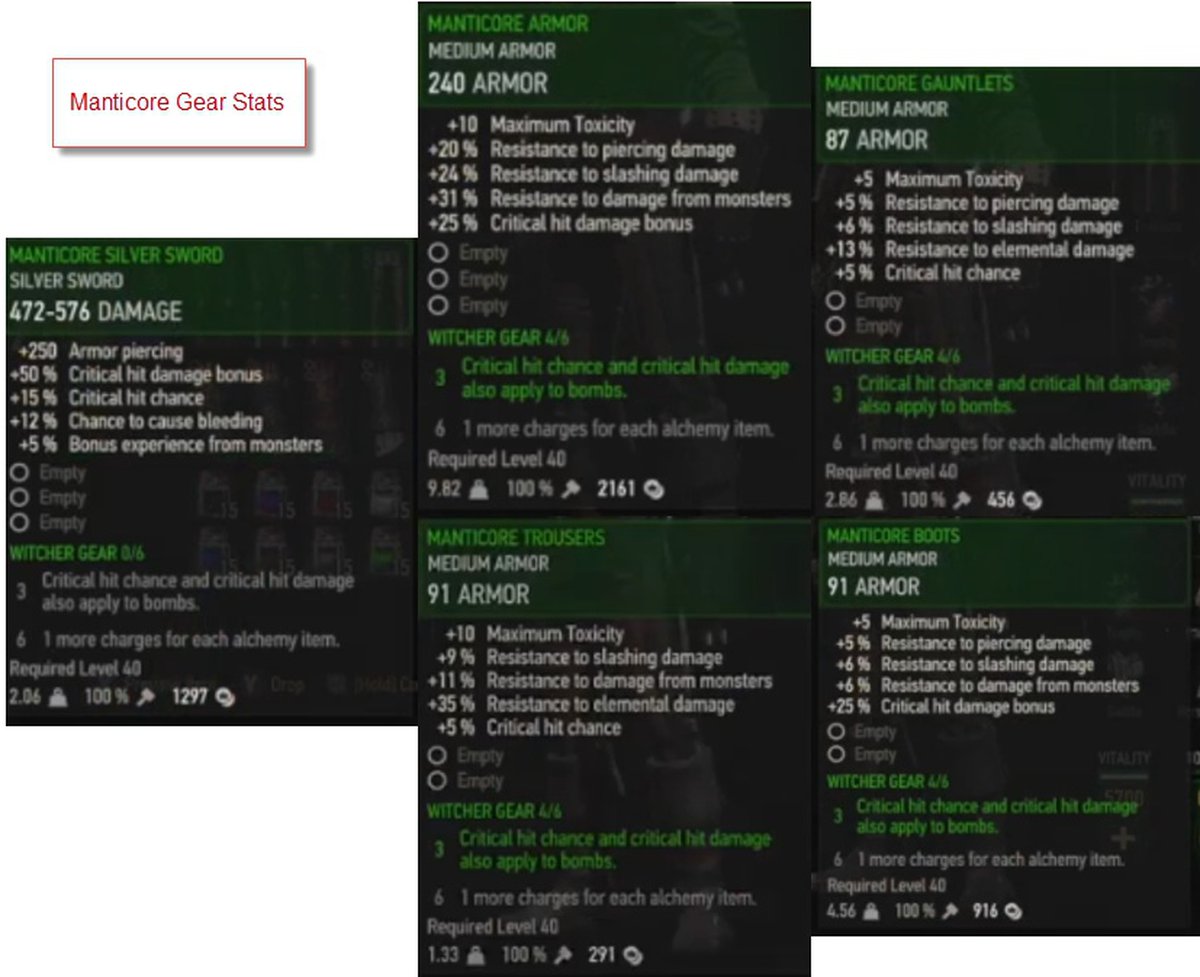 Из тех же геймплейных видео были добыты характеристики сета Мантикоры. Одноименного монстра в дополнении так и не появится, но броню Геральт все-таки сможет надеть.