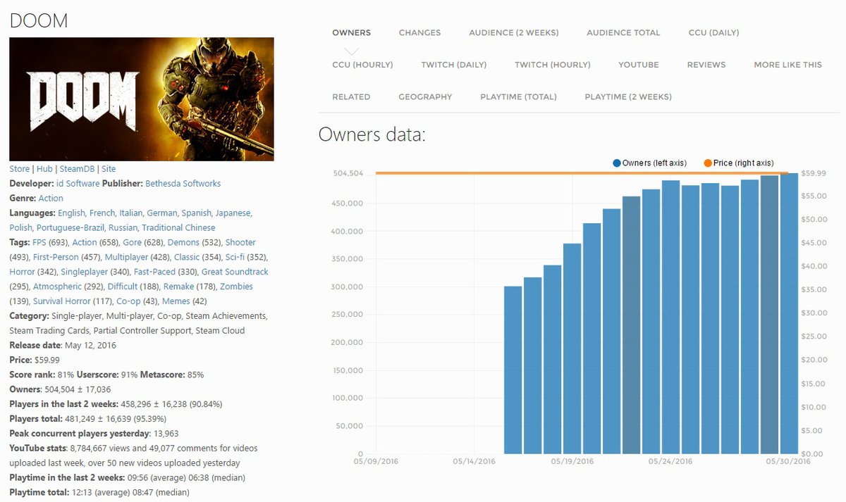 Bethesda пока не публиковала точные данные о продажах Doom на PlayStation 4 и Xbox One, однако благодаря сервису SteamSpy мы можем предположить, сколько копий игры было продано в Steam - сейчас у игроков есть порядка 500 тысяч копий Doom.