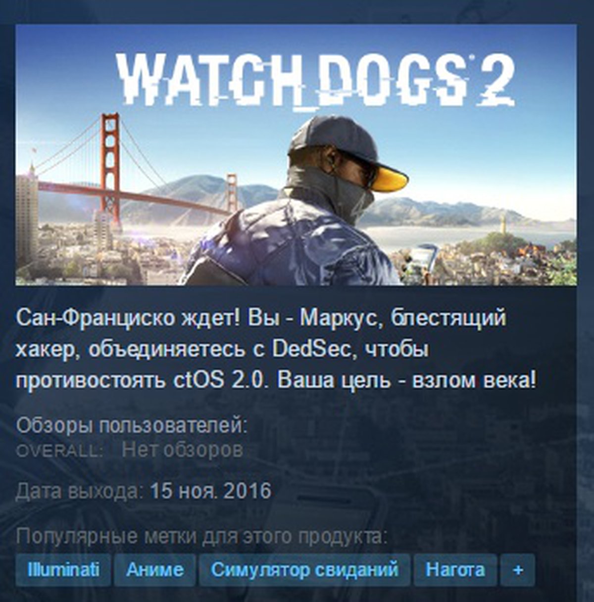 Пользовательские теги Steam сыграли с Watch Dogs 2 отличную шутку - судя по странице игры в магазине Valve, теперь Watch Dogs 2 это не хакерский экшен, а симулятор свиданий с элементами наготы и аниме. И, конечно, иллюминати.