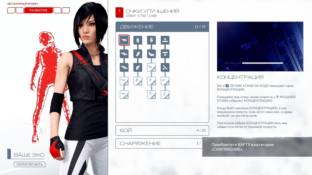 В этой системе есть косяк, который очень сильно меня поджёг. Для того, чтобы Фейт делала кувырок при падении, нужно прокачать соответствующий талант. Она же самый лучший бегун этой сомнительной курьерской компании! Видимо за время пребывания в тюрьме,мышцы у дамочки совсем атрофировались. Из-за этого она создаёт впечатление не суперспортсменки, а школьницы, которая только услышала про паркур и пошла практиковаться во дворе. Но это не так страшно, ведь мы можем прокачать эту способность в начале игры и не беспокоиться о том, что наша героиня целует бетон каждый раз после приземления с большой высоты.