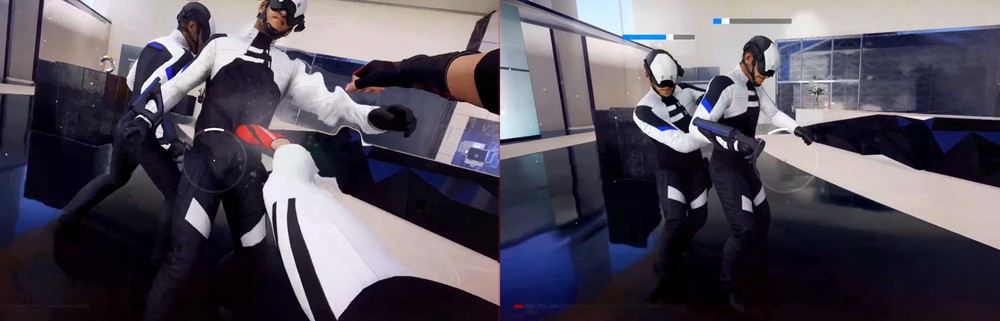 Разработчики сделали так, что противник будет получать урон от любого столкновения, будь то стена или другой солдат. На бумаге это выглядит неплохо, но в реальности некоторые враги умирают с подзатыльника, ударившись спиной об стол, а других приходится месить на протяжении получаса. При этом интеллект охранников просто ужасен, их реакция и решения настолько тупы, что диву даёшься. Можно бегать вокруг болванчиков и они ничего не смогут вам сделать! Идиотизм ботов раскрывается в полной мере, когда игра вынуждает вас драться сразу с несколькими. Грубо говоря, вам придётся бить морду каждому по очереди, так как в большинстве случаев, другие коллеги вашей жертвы будут стоять в стороне и лишь изредка делать выпады. Застрелить их у вас не выйдет, ибо Фейт больше не пользуется оружием, что на мой взгляд, хорошее решение. Она всё-таки бегун, а не солдат. Тем не менее вы можете избавиться от десятиминутного спарринга путём прокачки соответствующих боевых талантов, но, прежде чем вы это сделаете, помучиться вам всё равно придётся.