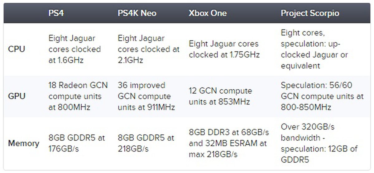Специалисты Digital Foundry считают, что Microsoft скорее всего пойдет по первому пути. Правда, новый процессор Jaguar, разработанный для Scorpio, будет существенно мощнее CPU, применяемых в консолях восьмого поколения - даже процессор PlayStation 4K, по слухам, на 600 МГц быстрее процессоров PS4 и XOne.