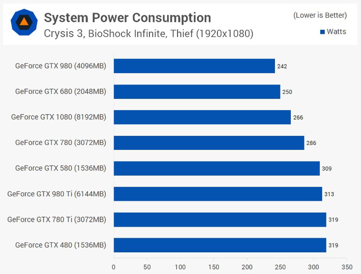 Приятная, но ожидаемая деталь: карты стали мощнее, а их энергопотребление пусть немного, но снизилось. Удивительно, но самой бережливой картой оказалась GTX 980 - разница с GTX 480 составила аж 77 ватт.