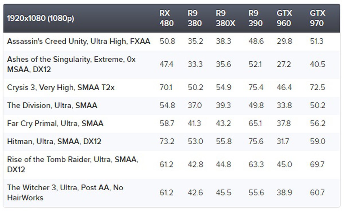 Оказалось, что производительность AMD Radeon RX 480 ближе всего к Nvidia GTX 970 или AMD Radeon R9 390: в некоторых играх новая карта AMD слегка обходит конкурентов, в некоторых - слегка уступает, но в целом RX 480 предлагает тот же уровень производительности, что и более дорогие карты, и значительно обходит стоящую те же $199 Nvidia GTX 960.