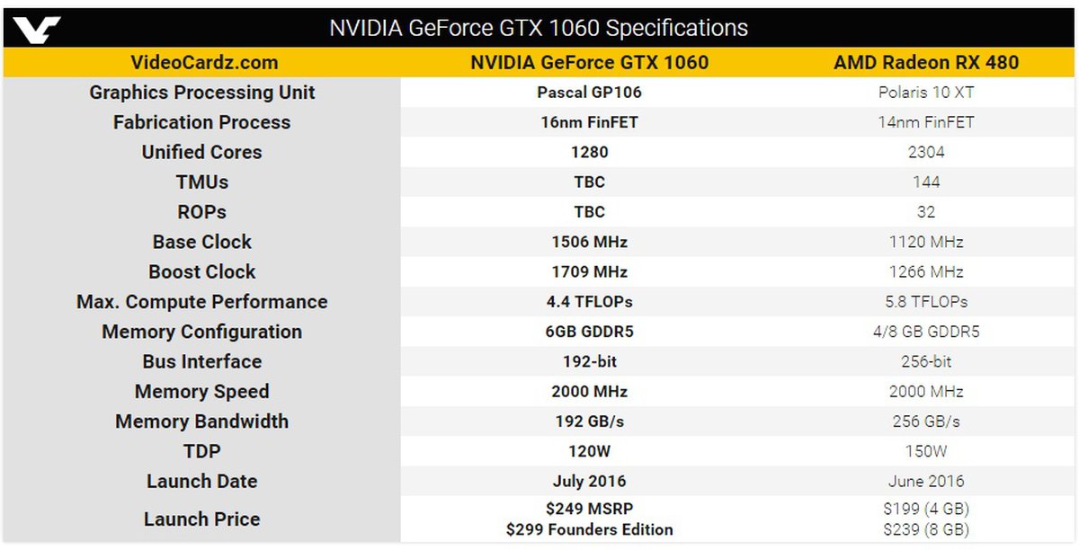 Чуть ниже можно увидеть сравнение характеристик Nvidia GTX 1060 и ее ближайшего конкурента, AMD Radeon RX 480. Судя по появившимся на китайских форумах тестам производительности GTX 1060, карта действительно слегка мощнее AMD RX 480: в тесте 3DMark Firestrike Ultra GTX 1060 набрала 3014 очков, у RX 480 показатели скромнее, от 2600 до 2800 очков.